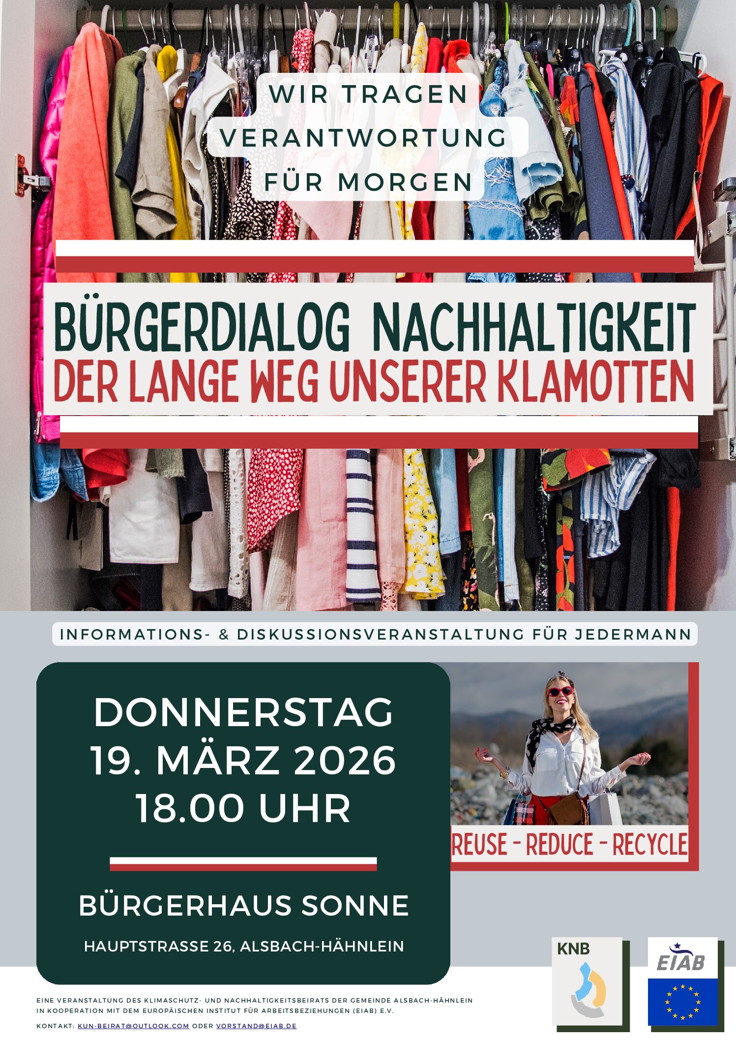 Am 19. März 2026 laden wir Sie herzlich zum Bürgerdialog mit dem Thema „Der lange Weg unserer Klamotten“ ein. Die Veranstaltung findet im Bürgerhaus zur Sonne in der Hauptstr. 26, 64665 Alsbach-Hähnlein statt.